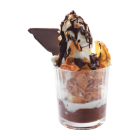 - チョコのスポンジケーキにたっぷりのソフトクリーム、チョコソースにナッツ類、そこに板チョコとチョコ三昧です。